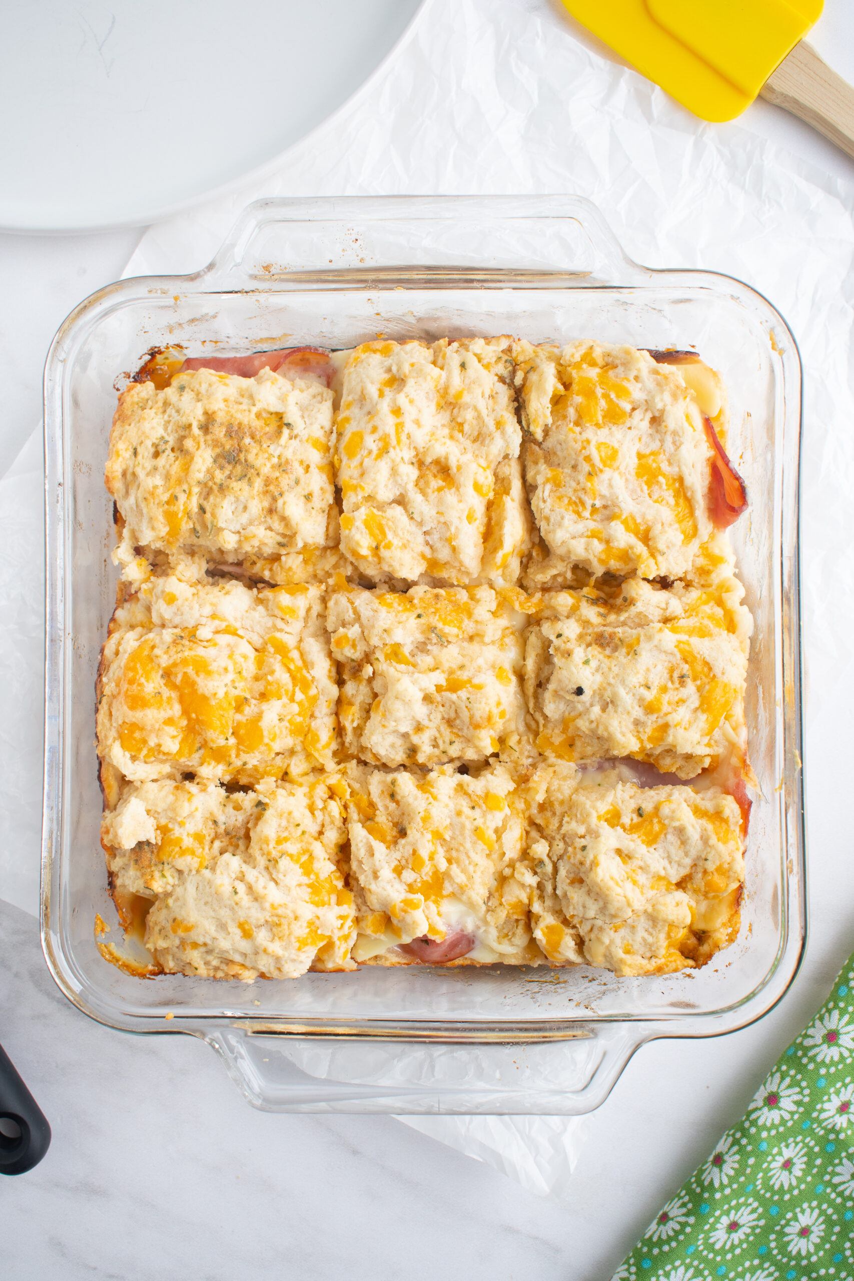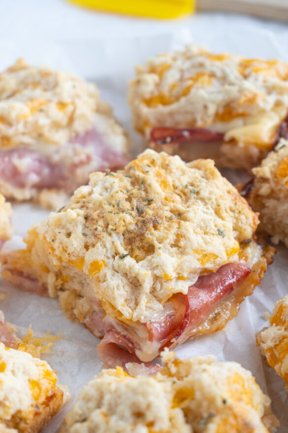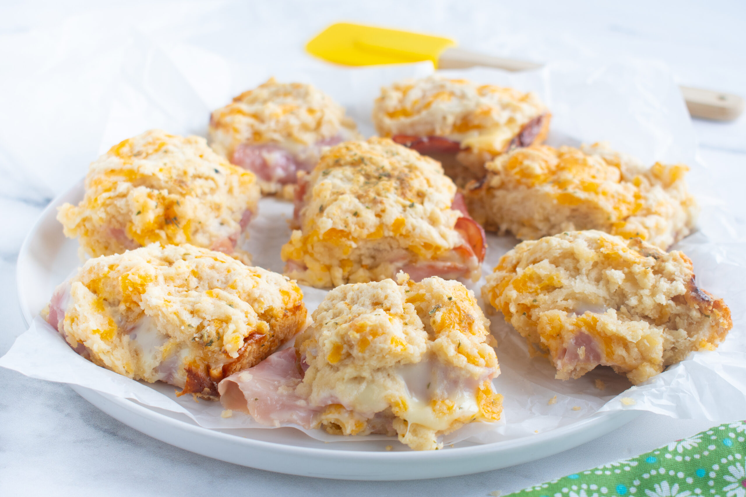 This recipe layers ham, cheddar cheese, and buttery biscuit dough for a warm, melty bite.