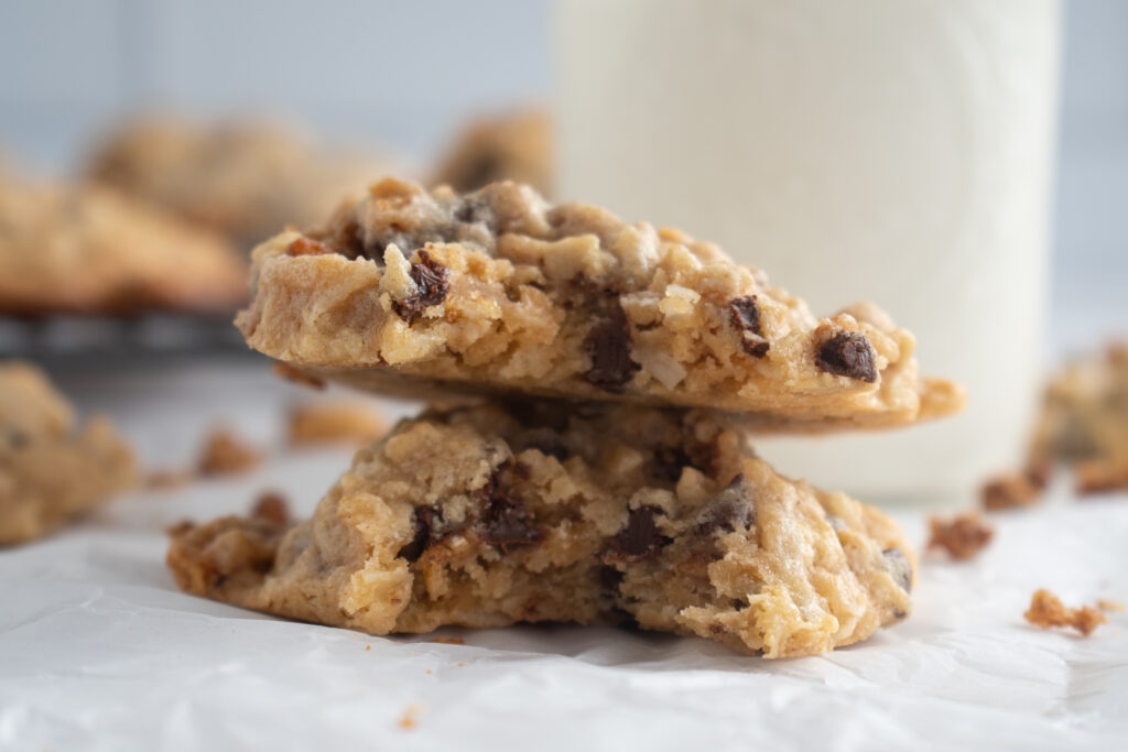 I have been searching for heartier baked goods to include in my middle school boys’ school lunches. In this process, I have discovered that granola gives cookies an incredible texture. My Cherry Granola cookies were a huge hit! Since I had some high-protein peanut butter granola in my pantry, I decided to make a peanut butter chocolate version of it. These cookies are packed with smooth peanut butter, melty chocolate chips, chewy coconut, and clusters of crunchy granola.