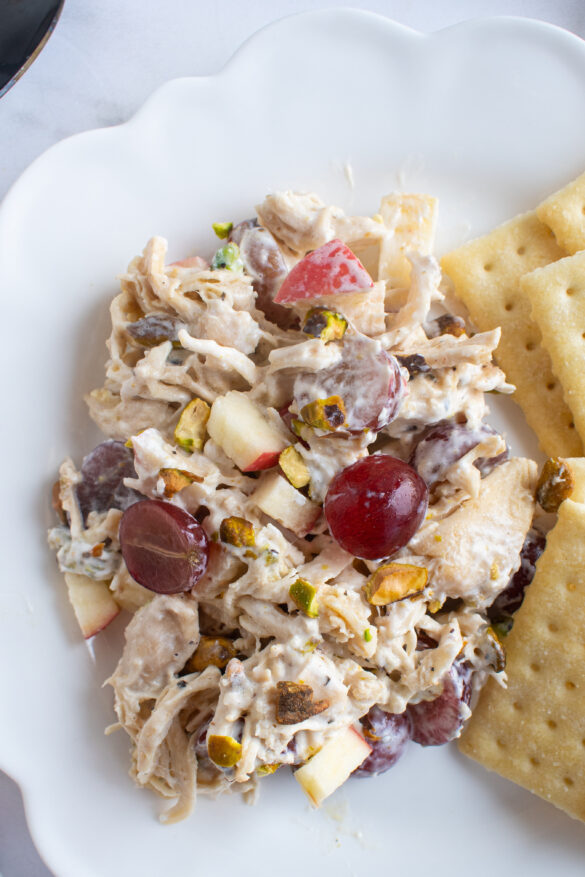 Italian chicken salad made with chicken slow cooked in Italian dressing then mixed with grapes apples pistachios and a creamy dressing.