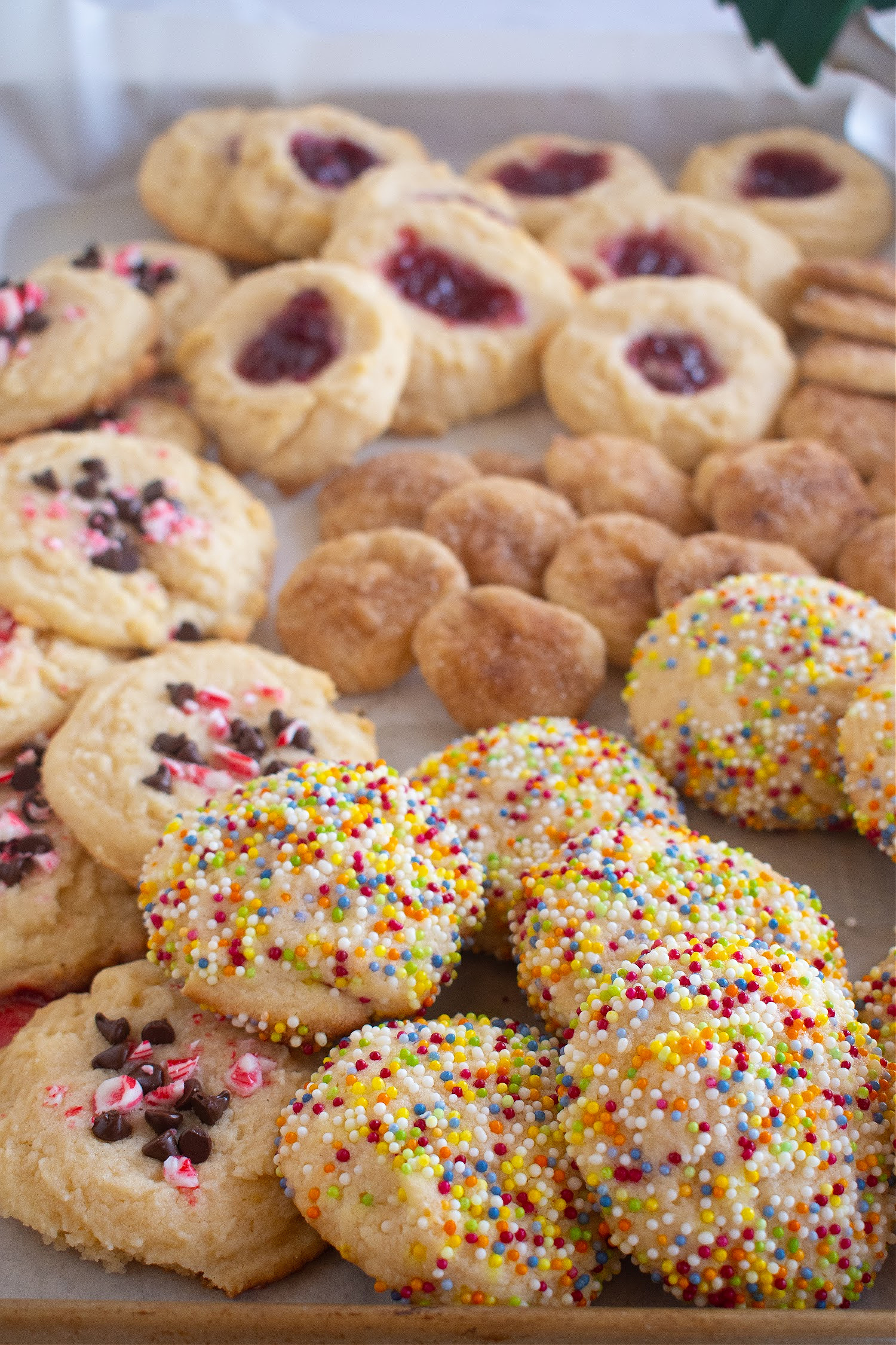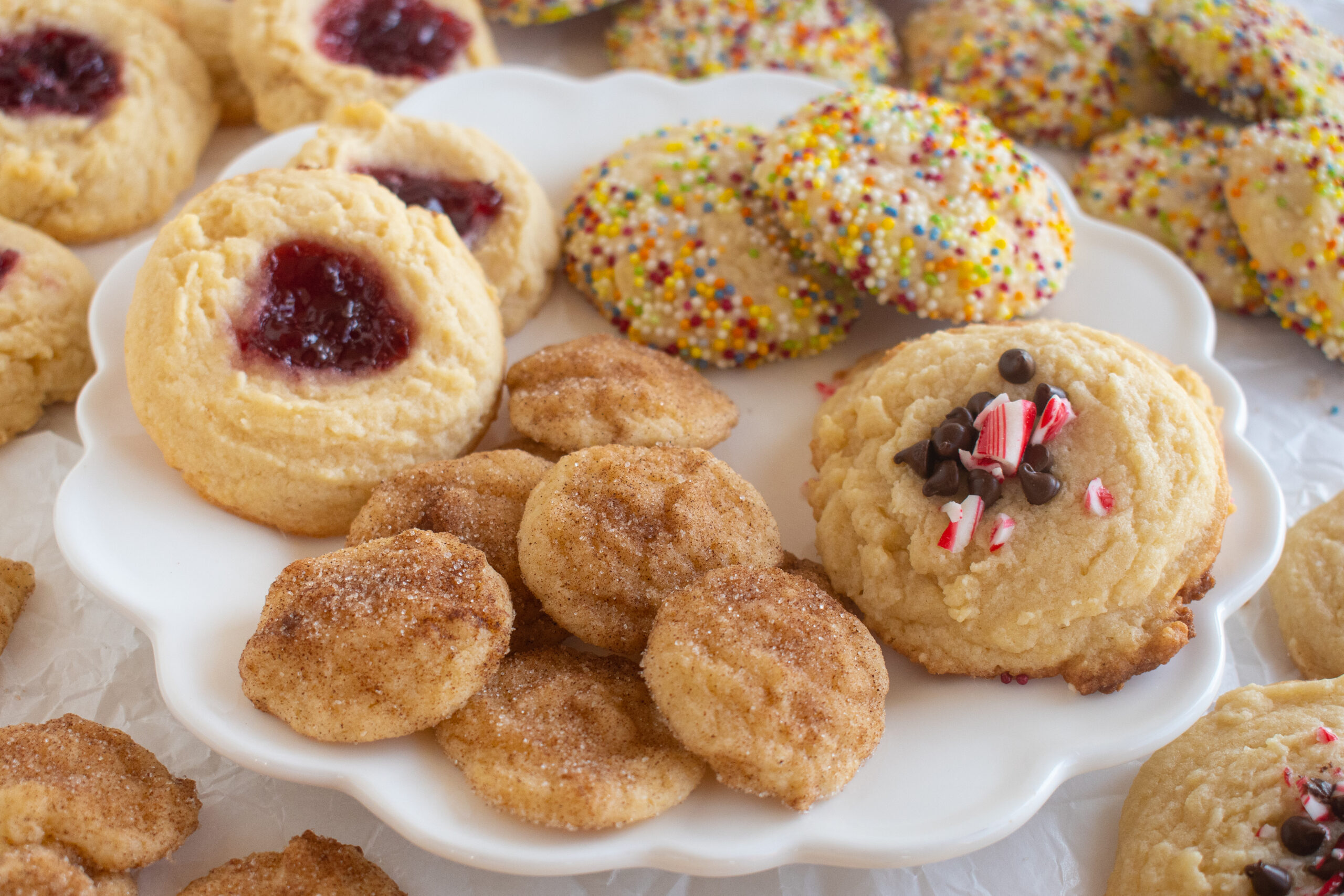 When I was a kid, my great aunt Shirley used to bring a plate of cookies from her church cookie exchange to my parents’ house on Christmas Eve. It was so much fun to try the different cookies! I have come up with the perfect one-batch cookie plate for the holidays. It is simple enough to make on a weekday and festive enough to share at Christmas.