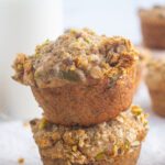 These Pistachio Banana Muffins with Pistachio Oatmeal Crumble are soft, flavorful, and a little bit special. They make the perfect treat for breakfast or an afternoon coffee break. I love how the pistachios and oatmeal crumble add a touch of texture and warmth to every bite.