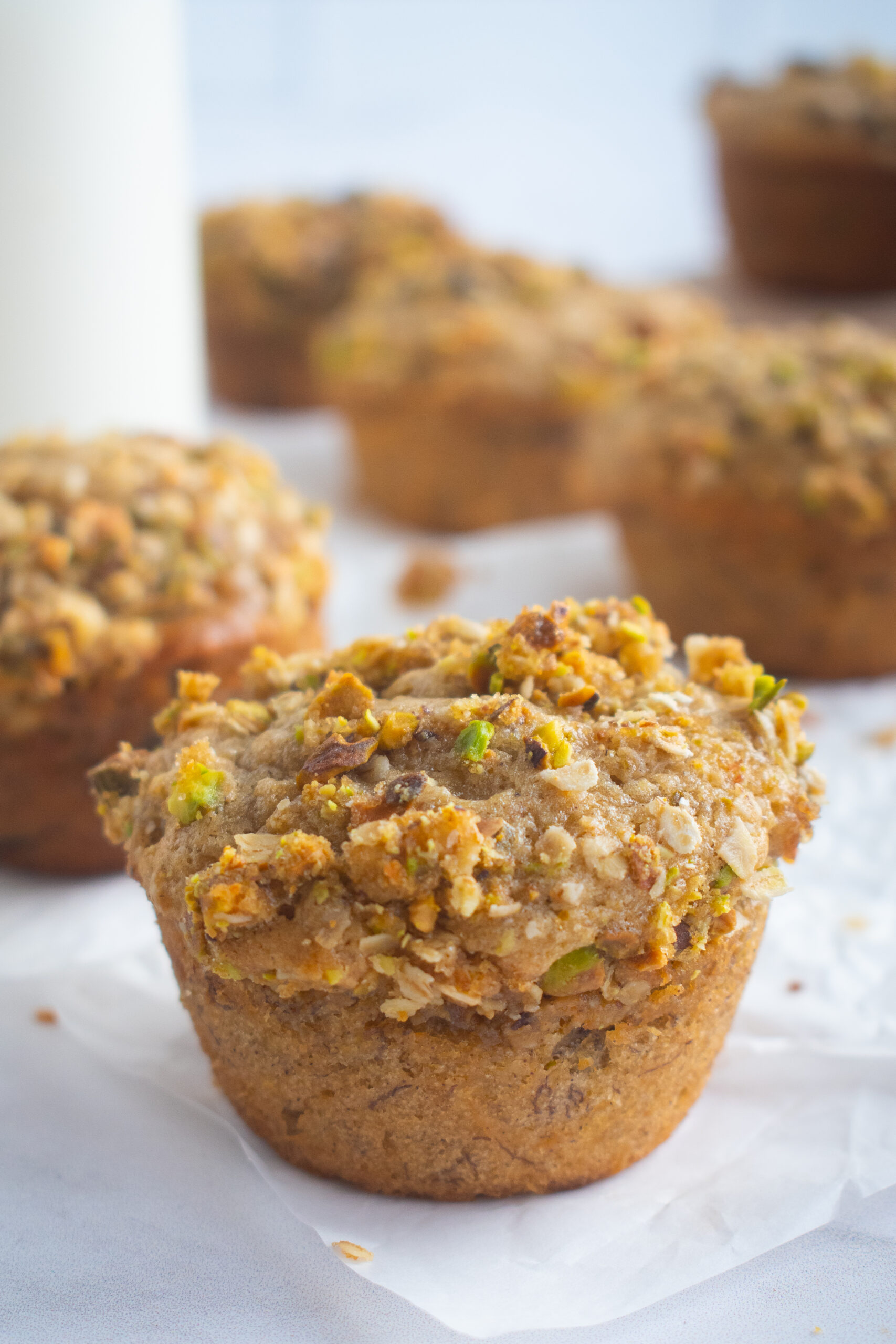 In a small bowl, combine the brown sugar, flour, oats, melted butter, and pistachios to make the pistachio oatmeal crumble. Sprinkle the crumble evenly over each muffin.