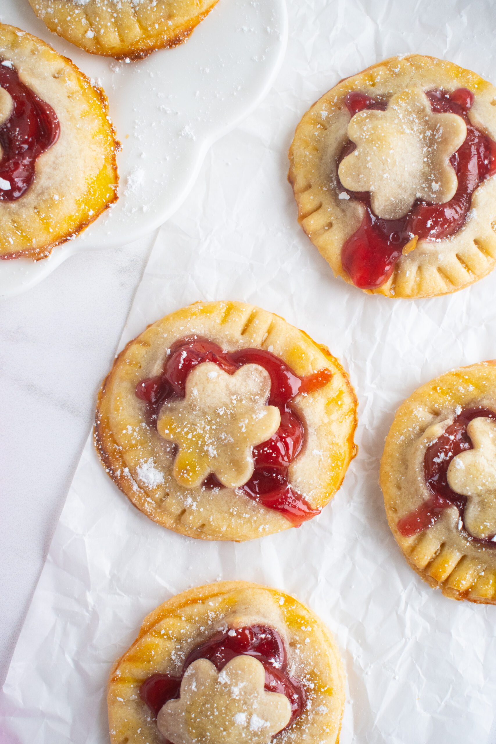 Use the second set of circles as the tops. Before placing them on the pies, use a tiny decorative cookie cutter to cut a small shape from the center of each. This creates a sweet little vent and a pretty topping.