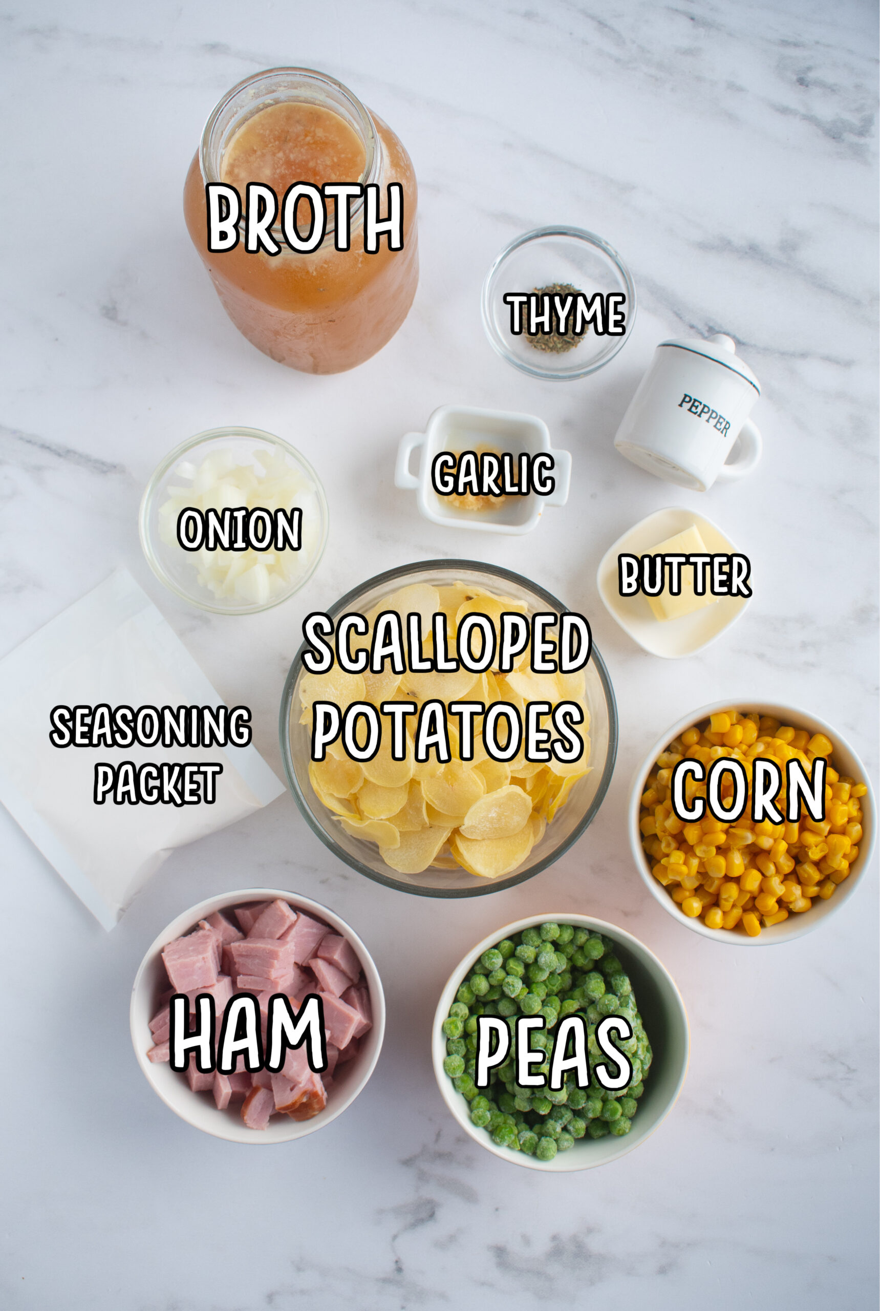 - Add scalloped potatoes, seasoning packets, chicken broth, and water.