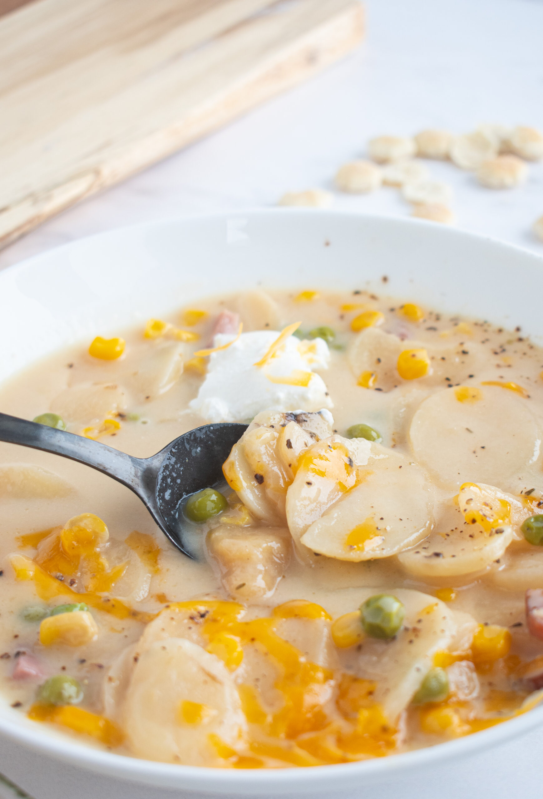 - Stir in cream, peas, ham, and corn during the last 30 minutes of cooking. Cover and cook until melted and creamy.