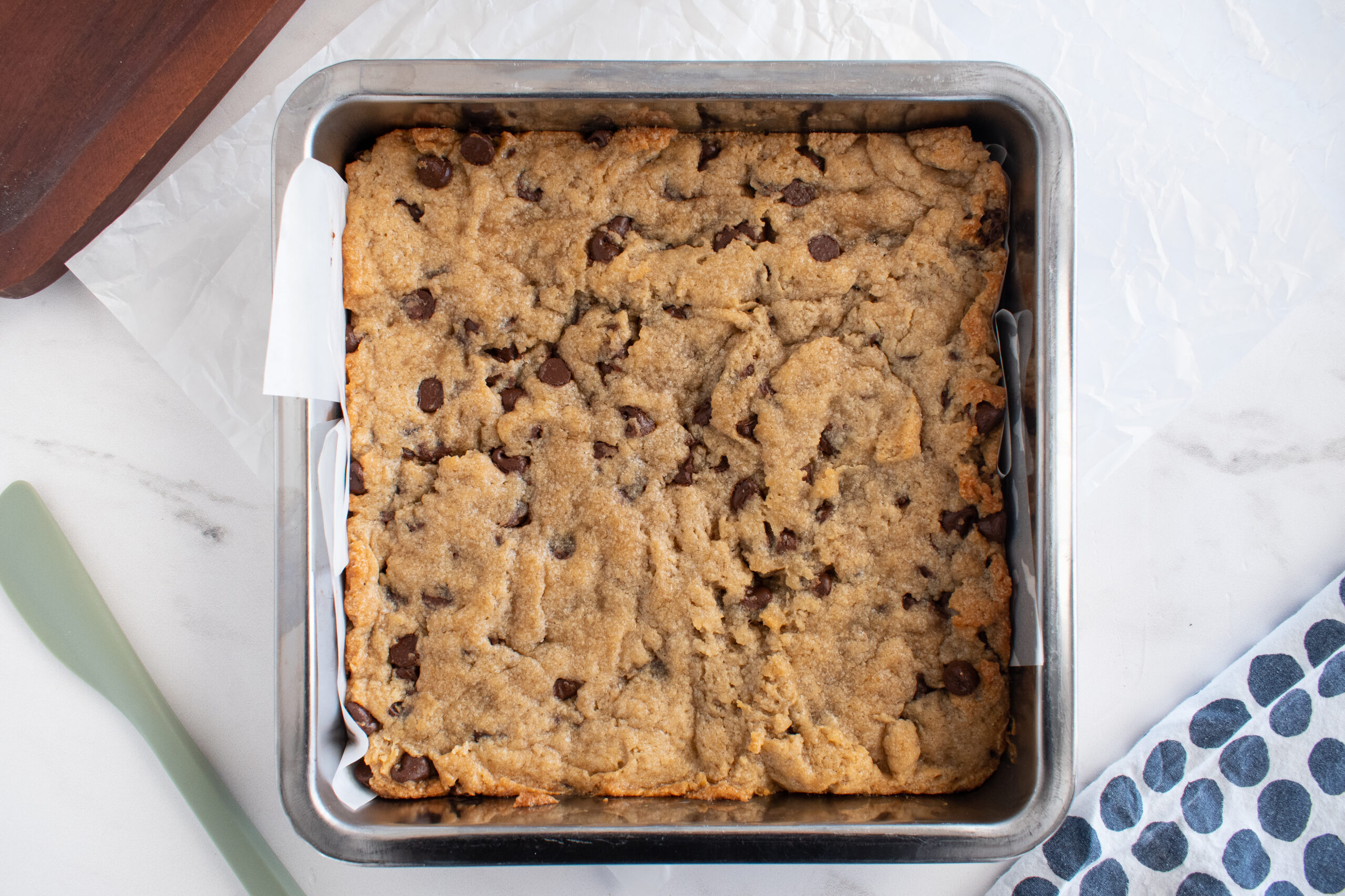 Preheat your oven to 350 degrees. Line an 8×8 pan with parchment paper and lightly grease if needed. Set aside.