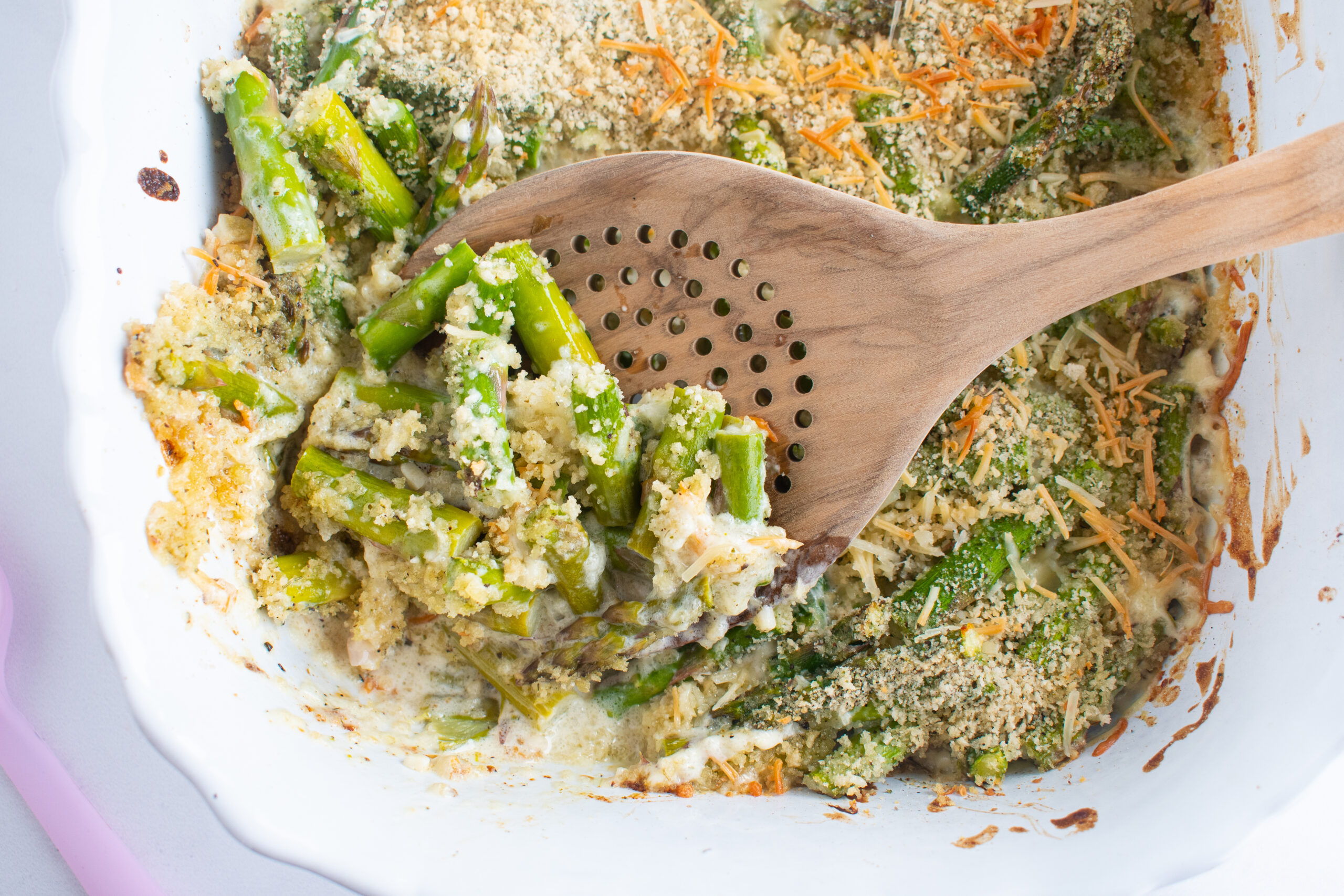 Another small detail that makes this recipe work so well is cutting the asparagus into bite-sized pieces before baking. This makes the dish easier to serve and ensures that every scoop includes tender asparagus, creamy lemon parmesan sauce, and crispy bread crumbs.