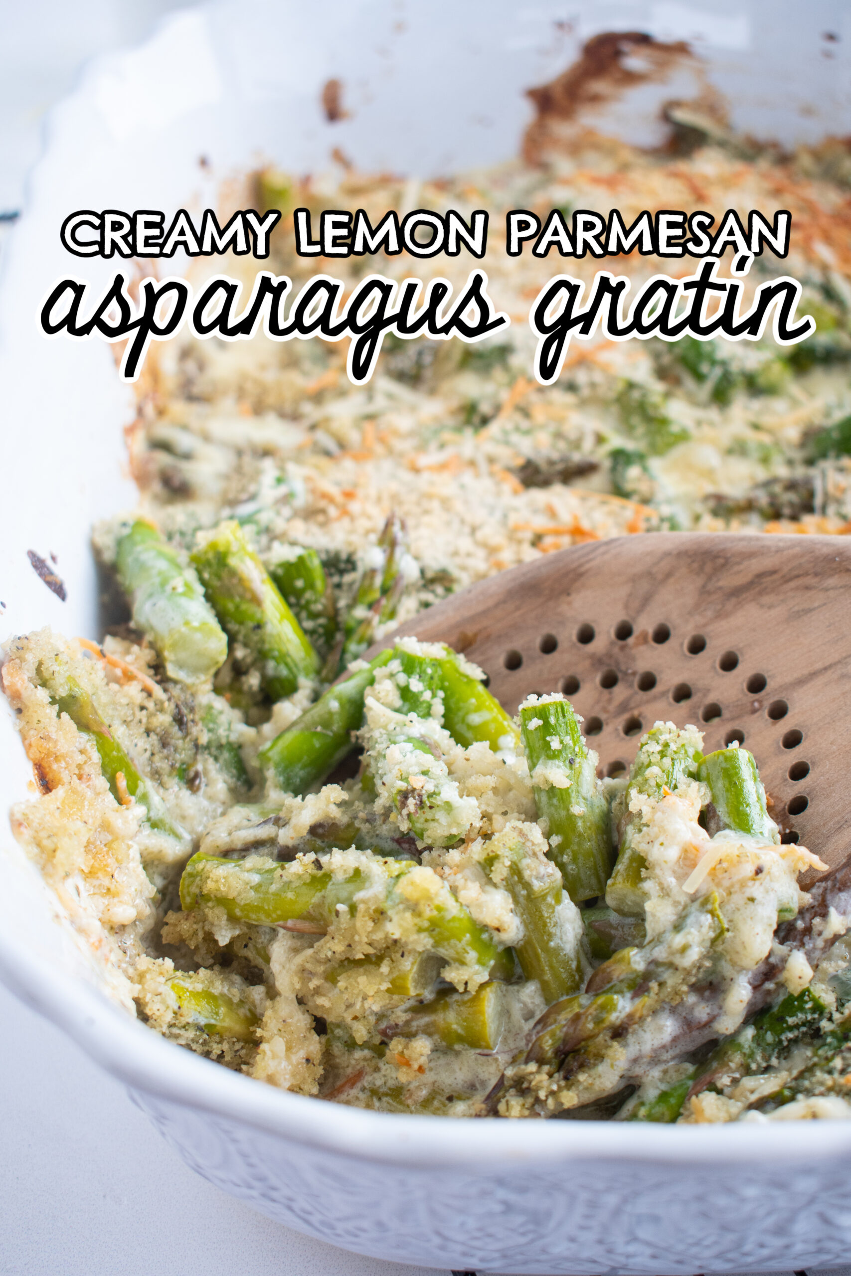 This lemon parmesan asparagus bake is a creamy oven-baked dish made with fresh asparagus, garlic, heavy cream, and parmesan cheese. Crispy bread crumbs on top add the perfect texture to this easy asparagus recipe.