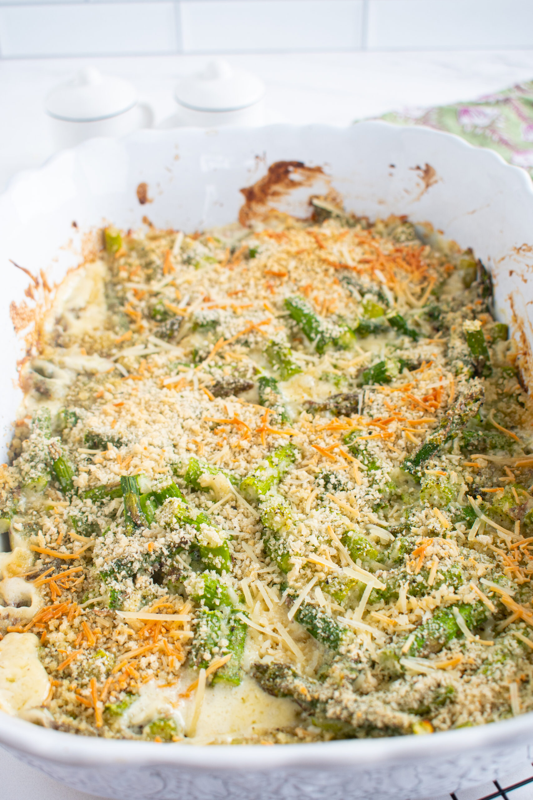 Fresh asparagus is one of my favorite vegetables to cook with, especially when it is in season. In this asparagus recipe, tender asparagus bakes in a creamy lemon parmesan sauce made with garlic, butter, heavy cream, and parmesan cheese, then finishes with crispy bread crumbs on top.