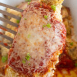 Bake in the oven until the coating is golden brown and the chicken is cooked through. Remove the dish, spoon marinara sauce over each piece, and top with mozzarella and a little more parmesan cheese. Return to the oven for 10-15 minutes until the cheese is melted and bubbly. Serve.